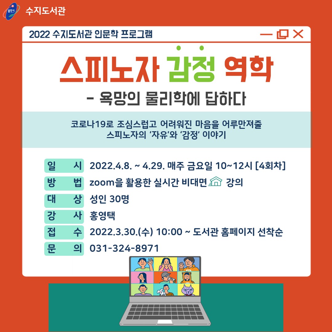 그리고 이번에도 인연이 닿아 재개관하는 수지도서관에서 4월8일부터 29일까지 매주 금요일 4번에 걸쳐 '스피노자 감정역학'을 강의하게 되었습니다. 코로나19를 경험하면서 다른사람과의 관계를 어떻게 해야할지 어려워졌고, 또한 자신도 이해할 수 없는 급변하는 자신의 감정들에 놀라기도 합니다. 신앙에서 과학으로 삶의 중심이 변화하던 시기에 새로운 '윤리학(에티카)'을 써내려간 스피노자를 공부하면서 좌도 우도 없고, 위도 아래도 없어 보이는 마치 허공에 떠있는 것 같은 삶을 조금 더 지혜롭게 살아가기를 바라봅니다.