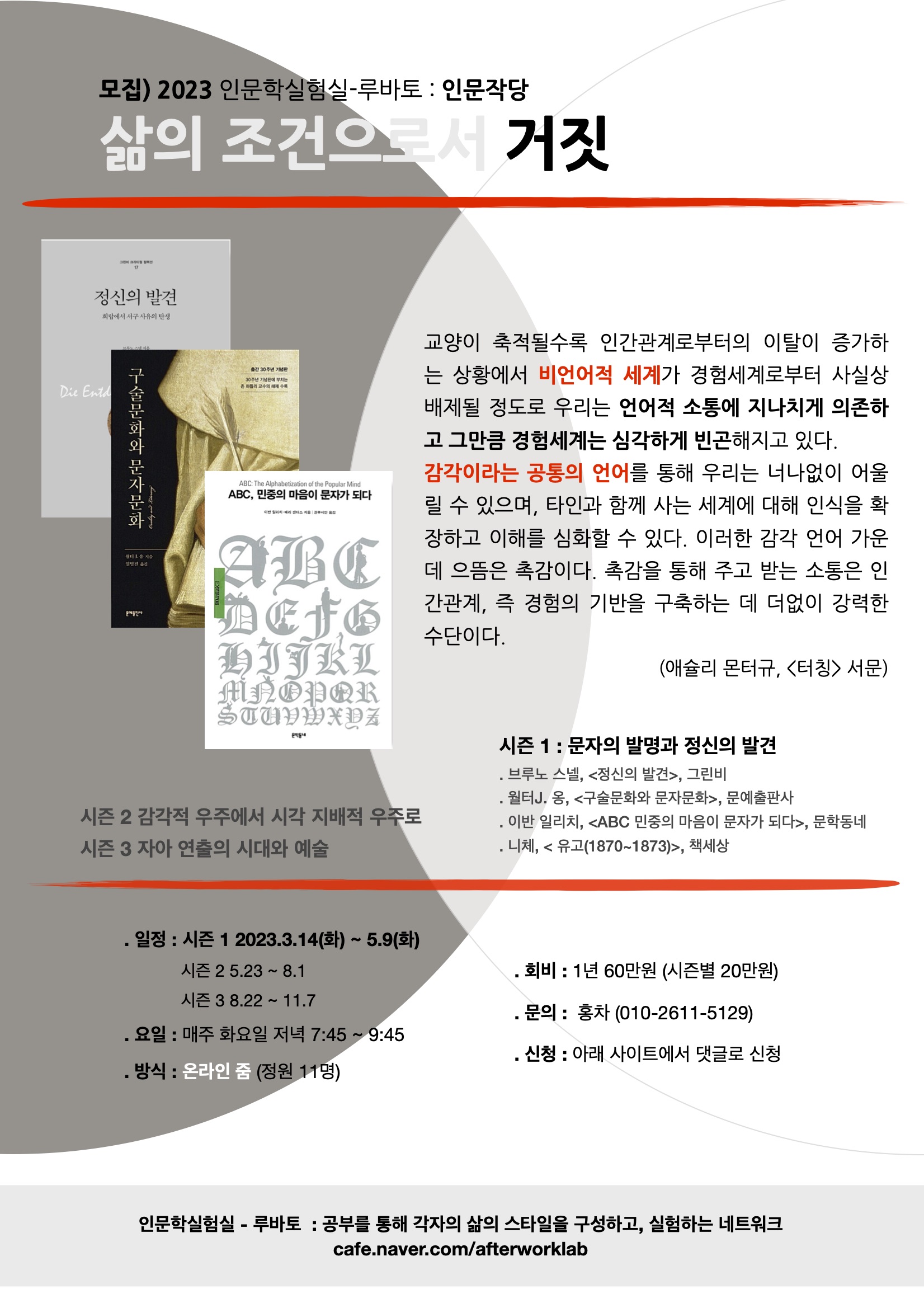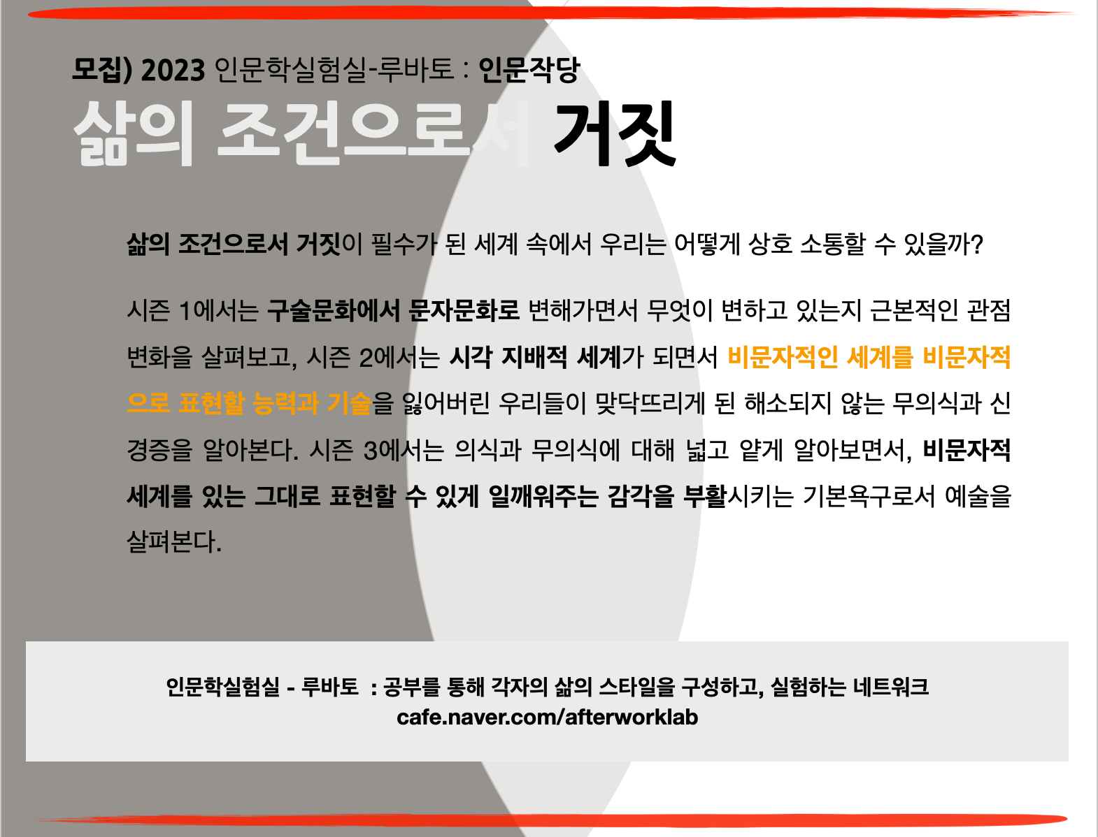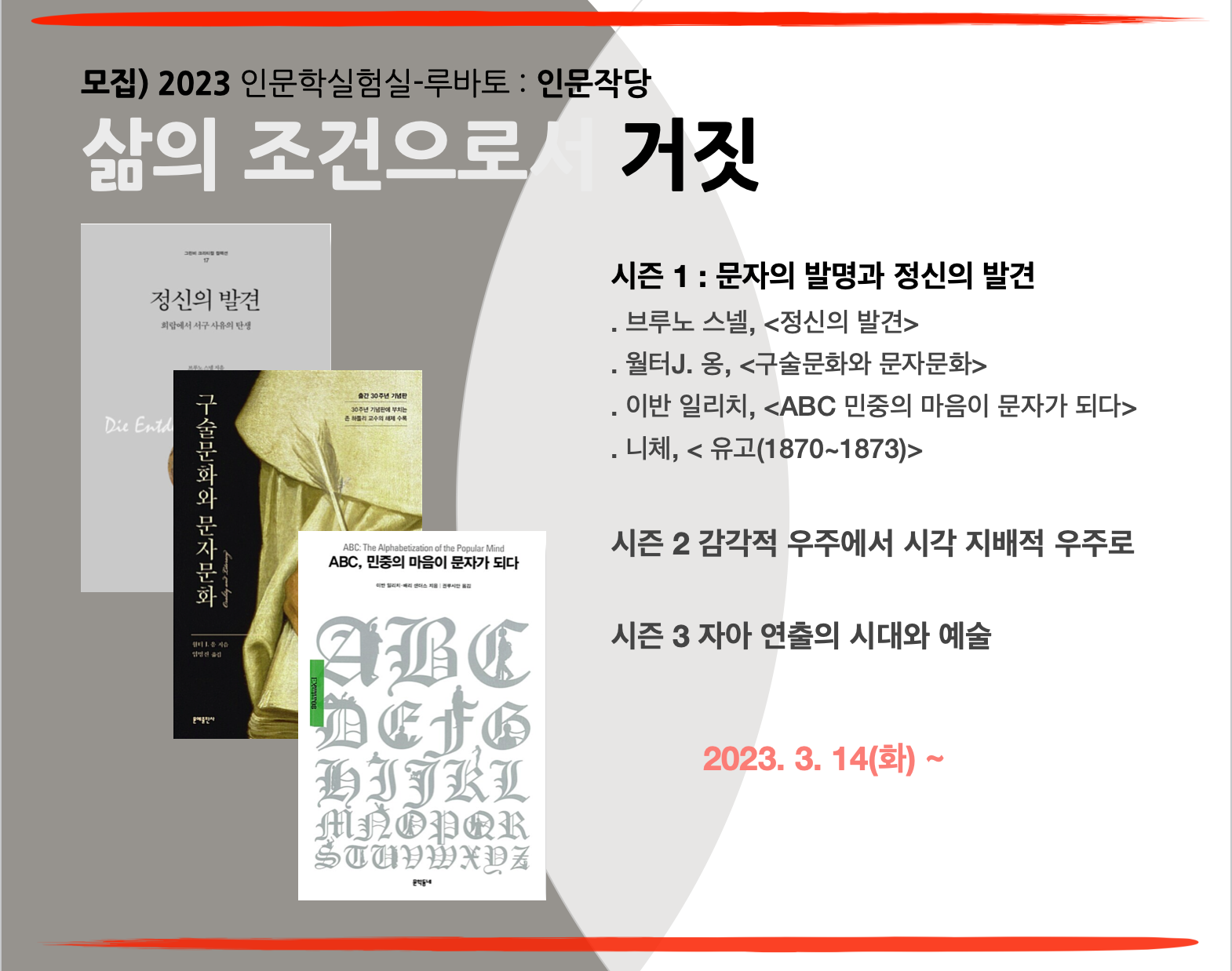 시즌 1에서는 구술문화에서 문자문화로 변해가면서 무엇이 변하고 있는지 근본적인 관점변화을 살펴보고, 시즌 2에서는 시각 지배적 세계가 되면서 비문자적인 세계를 비문자적으로 표현할 능력과 기술을 잃어버린 우리들이 맞닥뜨리게 된 해소되지 않는 무의식과 신경증을 알아본다. 시즌 3에서는 의식과 무의식에 대해 넓고 얕게 알아보면서, 비문자적 세계를 있는 그대로 표현할 수 있게 일깨워주는 감각을 부활시키는 기본욕구로서 예술을 살펴본다.