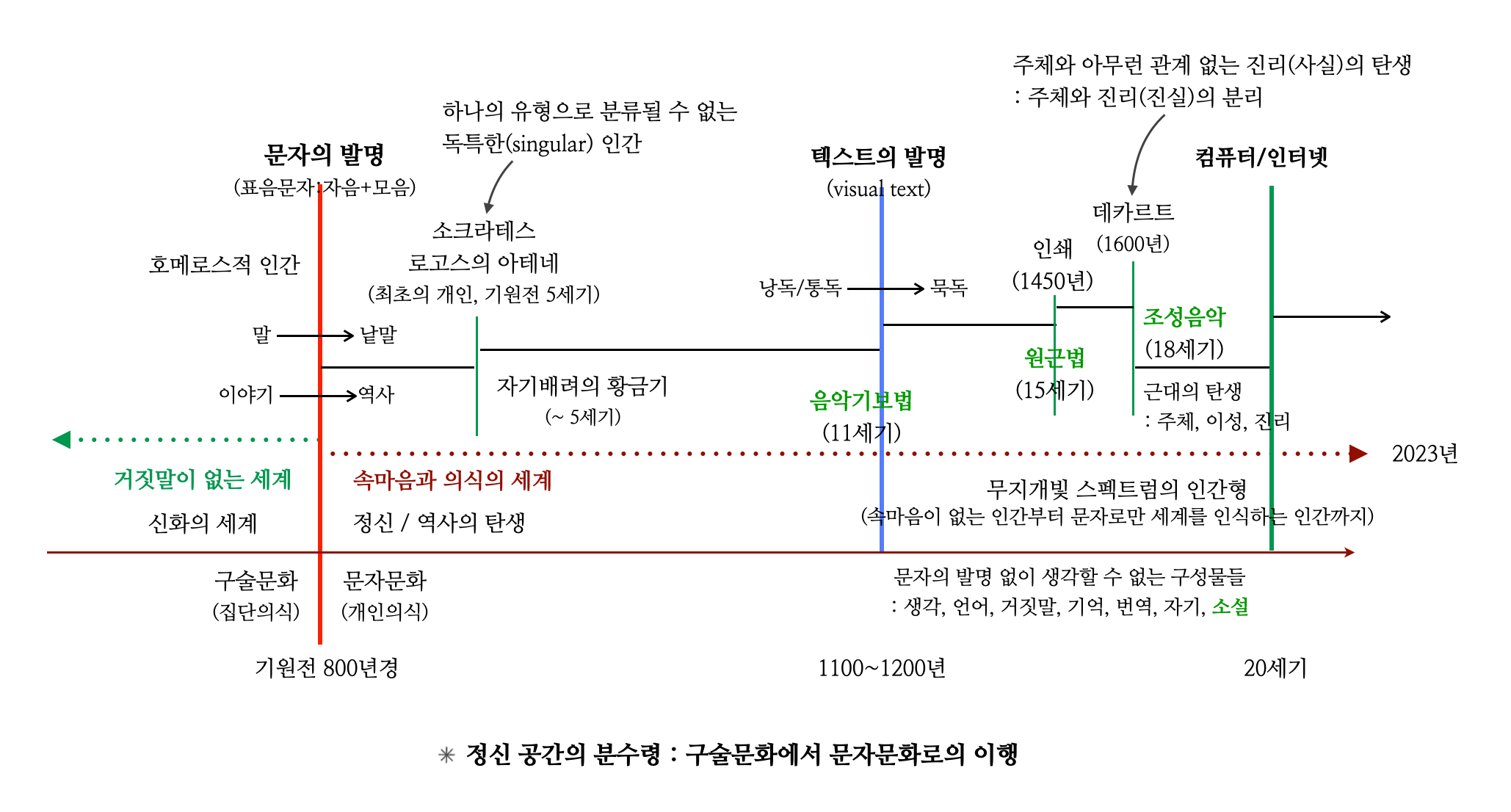 최근 2~3년 이내에 함께 세미나를 했거나 강의를 들었던 분들은 아시겠지만 저의 관심사는 '문자와 정신공간'입니다. 프루스트의 <잃어버린 시간을 찾아서>를 읽어도, 스탕달의 <적과흑>을 볼 때도, 들뢰즈의 <천개의 고원>을 공부할 때도, 심지어는 스피노자의 <에티카>를 읽을 때도 '문자와 정신공간'에 대해서 이야기했습니다. 왜냐하면 문자가 없었던 구술성의 시대와 달라 문자의 발명과 함께 현재 자아라고 하는 자기인식, 정신의 발명이 나타났기 때문입니다. 놀라운 점은 우리가 이 사실을 모르고, 원래부터 '자아'라는 것이 있다고 생각하고 살아간다는 점입니다.
