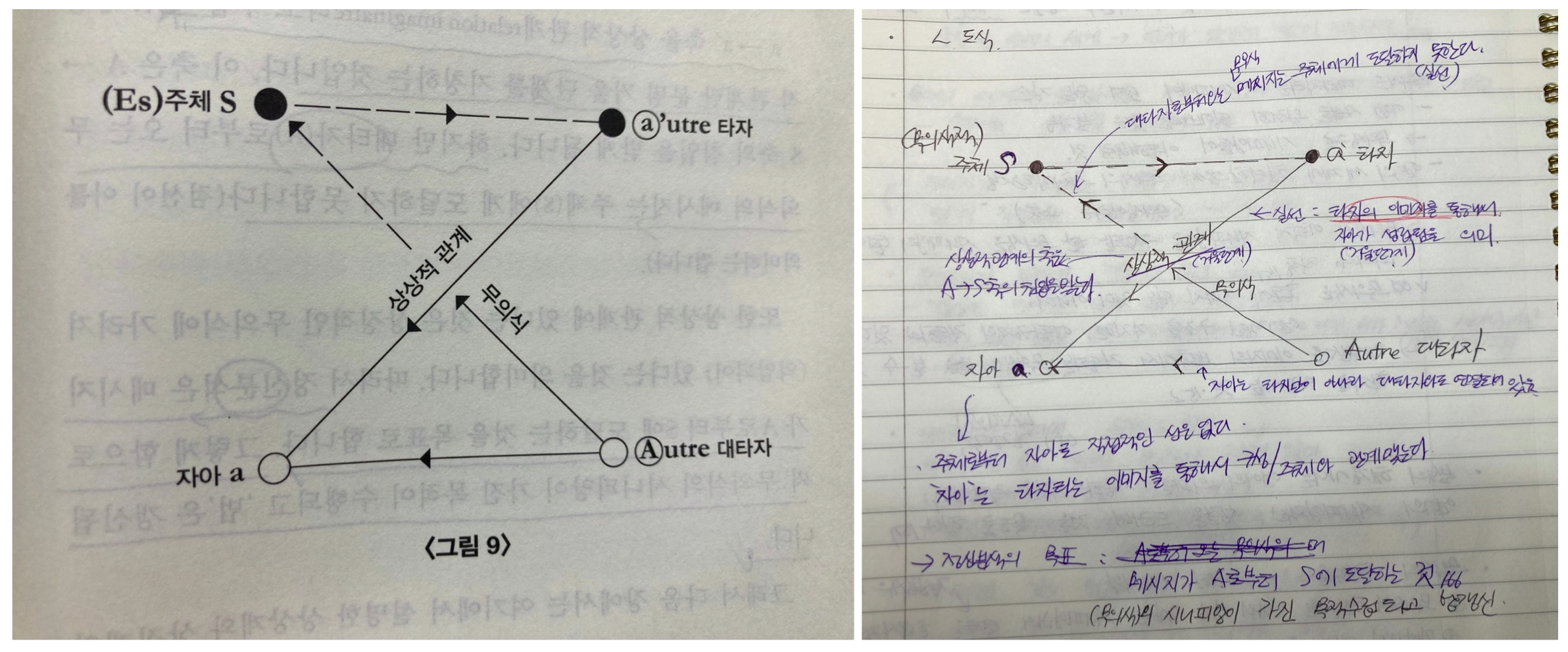 이 도식에서 가장 중요한 지점은 무의식적 주체(이후 주체)는 자아와 직접적으로 연결되지 않는다는 사실이다. 어떤 면에서 보면 주체와 자아는 아무 상관이 없다고 말할수 있다. 그렇다면 자아는 어떻게 형성되는가? 자아는 타자(의 이미지)를 통해서 구성됩니다. 도식에서 보면 S-a'-a 로 연결되는 것이 거울 단계이다. 실제 거울의 이미지처럼 타자에게 비춰진 혹은 타자가 기대하는 이미지로 자아는 형성된다. 중요한 것은 자아의 구성은 타자만이 아니라 대타자의 법에도 영향을 받는다는 점이다. 타자 혹은 대타자 어디에 더 큰 영향을 받느냐에 따라 자아의 모습이 달라질 것. 이런 방식으로 자아가 형성되기 때문에 주체와 자아 사이의 간극, 부조화를 인지하는게 중요하다.