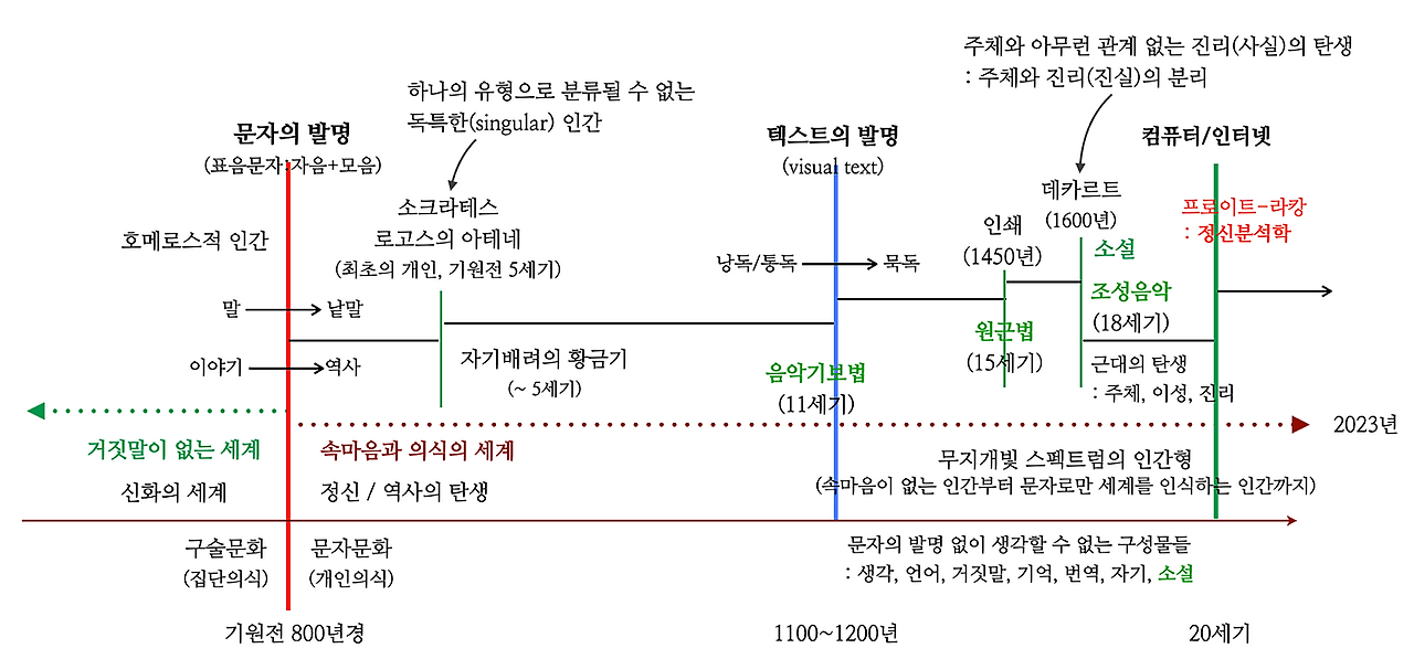 문자의 발명과 함께 인간은 자신의 내부에서 일어나는 충동을 있는 그대로 전달하지 못하는 존재가 되었습니다. 이러한 간극은 정신적, 신체적인 불안을 일으키고 있습니다. 그렇다고 문자 이전의 세계, 자연인으로 회귀할 수는 없습니다. 삶의 조건으로서 자기와 자기 인식의 간극을 인정하면서 조금 더 신체적이고, 생성하는 삶을 사는 방법을 발명해야 합니다.