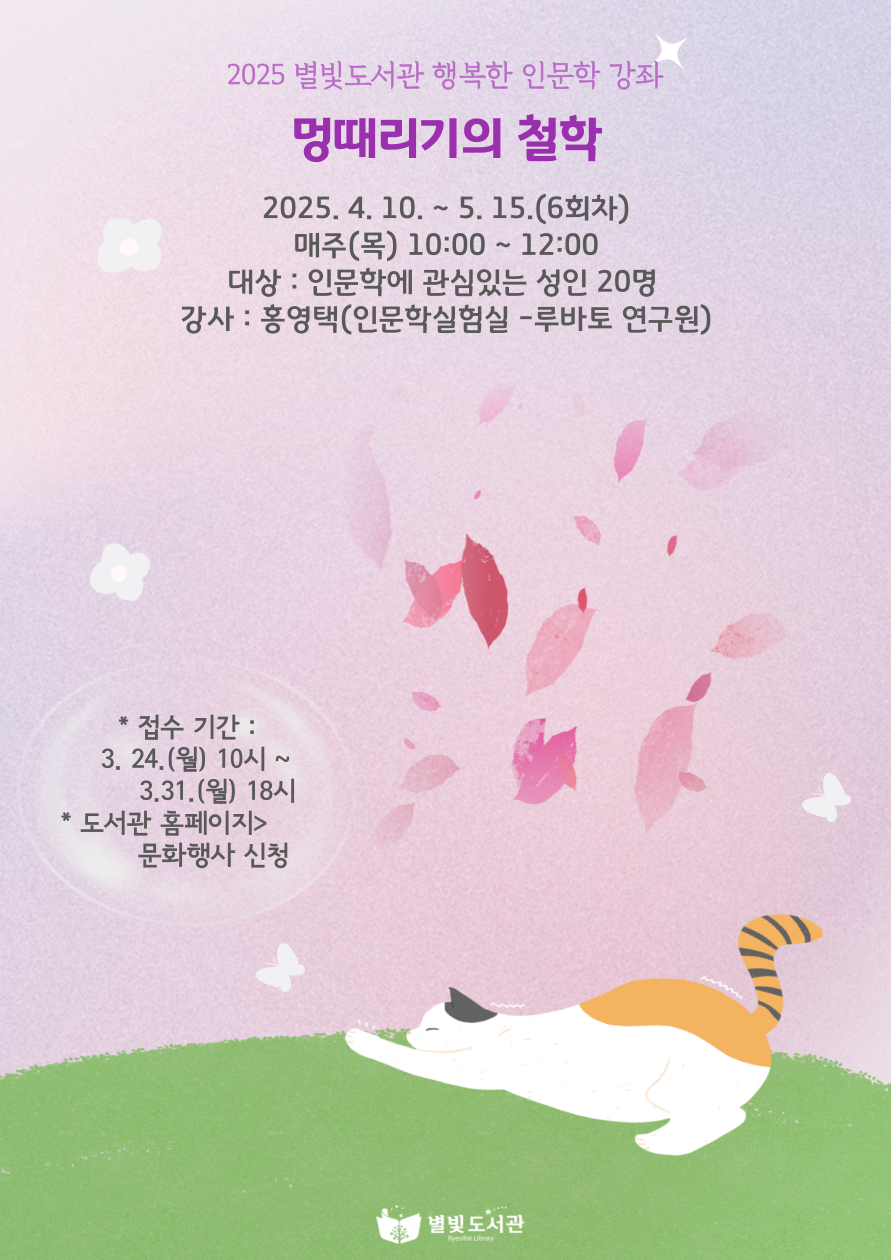 남양주별빛도서관에서 <멍때리기의 철학>이라는 제목으로 강의가 진행됩니다. 도서관에서 "정신적인 쉼이 필요한 현대인들을 위한 철학 강좌"라고 올려놓았는데, 딱 어울리는 설명인 것 같습니다. 최근들어서 가장 이야기하고 싶은 주제라도 저도 기대가 많이 되네요. 아래 강의 기획 및 주제를 올려놓으니 참고하셔요.