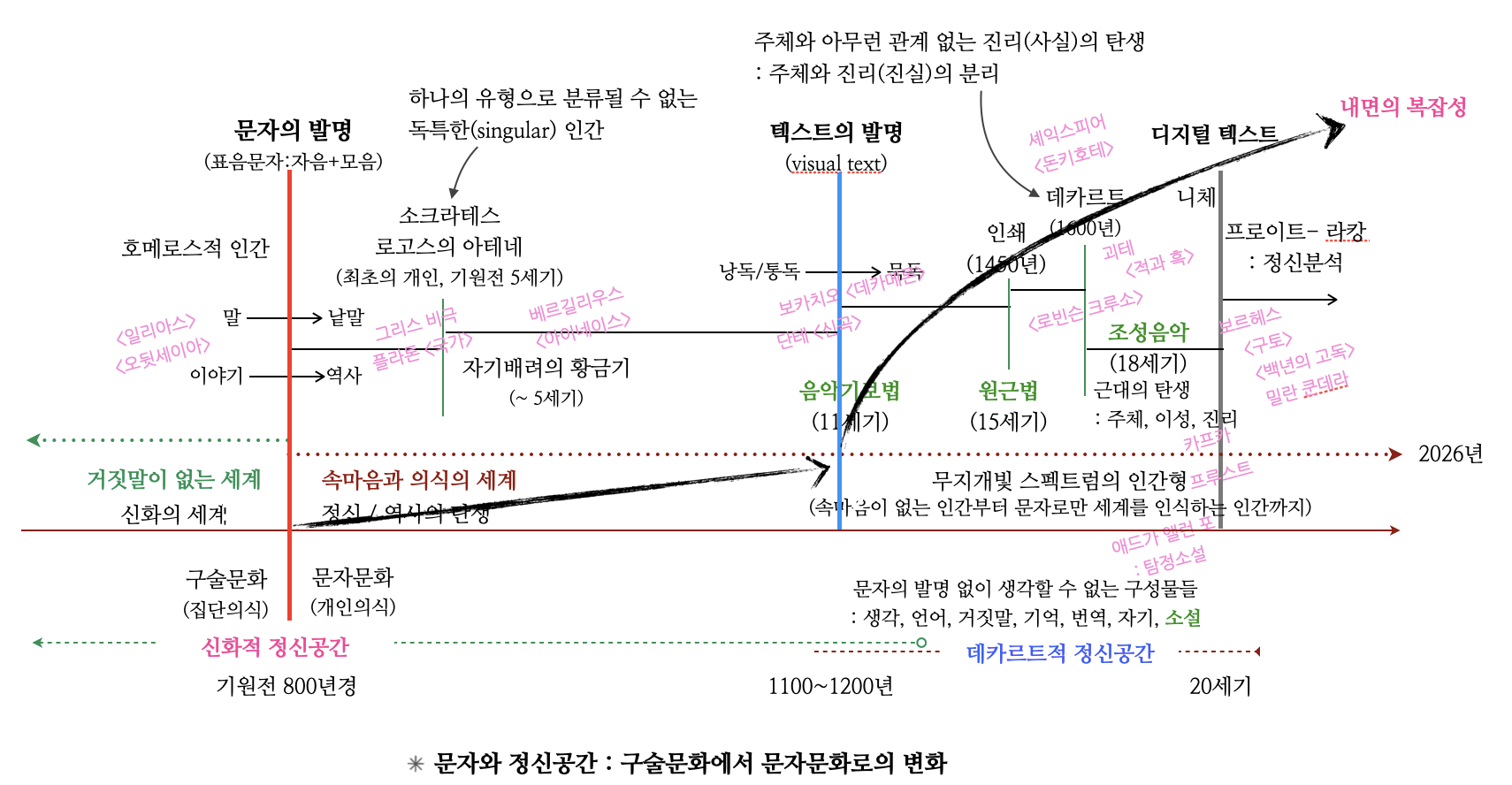위을 글을 보면 알 수 있듯이 문자라는 기술은 곧바로 정신공간에 영향을 준다. 문자뿐만 아니라 컴퓨터, 인터넷, AI와 같은 기술의 발전은 지금도 우리 정신공간을 바꾸고 있다. 이렇게 문자의 탄생은 곧바로 집단과 떨어진 개인을 발명해내면서 자기와 자기 인식의 분리를 가져왔는데, 문자와 정신공간의 측면에서 보면 한글은 아주 개별적인 개인을 생산하기에 최적의 문자라고 할 수 있다. 즉 1980년대 이후 디지털 세계에 알맞은 도구인 한글과 디지털 세계에 적합한 정신공간을 가지고 있는 한국은 점점 더 세계적으로 뛰어난 역량을 보일 수 있었다. 다만 문제가 되는 것은 한글이 가진 장점은, 그대로 단점으로 드러난다는 점이다. 가장 과학적인 언어를 가졌다는 것, 가장 명료하게 무언가를 표현할 수 있다는 것은, 개인의 주체성 - 내면의 복잡성이 최고로 높아질 수 있다는 점이다. 정신분석학적으로 본다면, 가장 과학적인 언어로 형성된 정신공간에서 의식과 무의식의 틈이 가장 넓게 벌어진다는 점이다.