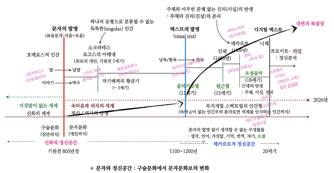 '문자와 정신공간'에 대한 이야기를 또다시 하지 않을 수 없다. 문자 이전에 개인, 정신, 자아, 소유와 같은 개념들은 없었다. 당연히 사람들이 있었지만 이 사람들은 집단의식을 가진 일부였고, 집단의식과 떨어져 '자기 인식을 가진 개인'들은 존재하지 않았다. 문자 이전의 인간들은 '신화적 정신공간'을 가지고 삶을 살아갔다. 문자 이전의 집단적 인간들에게는 소크라테스가 "먼지 속에 쏟아 부었다는 마법의 술"(175)이란 아주 익숙한 것이었고, 마법적(신화적) 힘을 인정하지 않고 살아간다는 것을 불가능했다. 그때는 의식과 무의식이 분리되지 않은, 자아와 주체가 일치하는 일종의 원형적 인간 모습을 갖고 있었다.