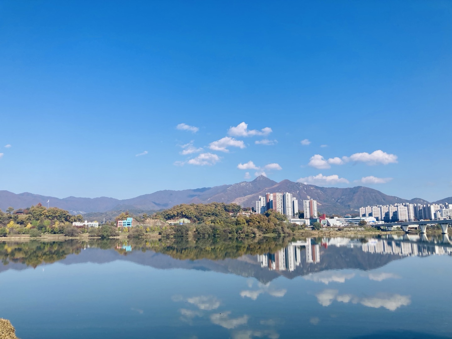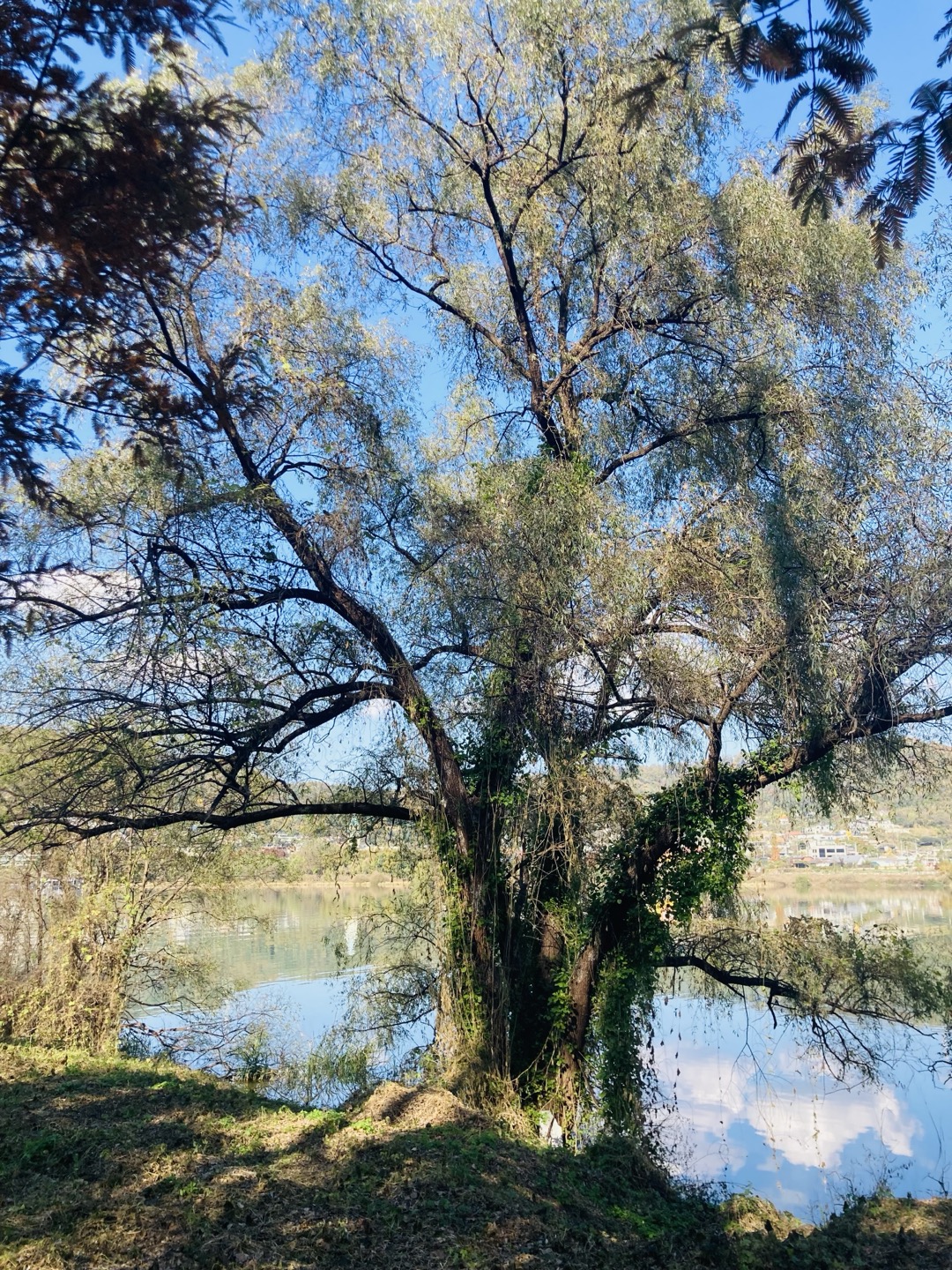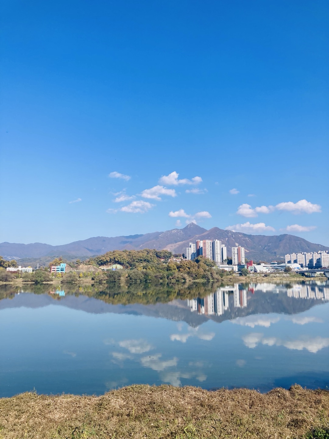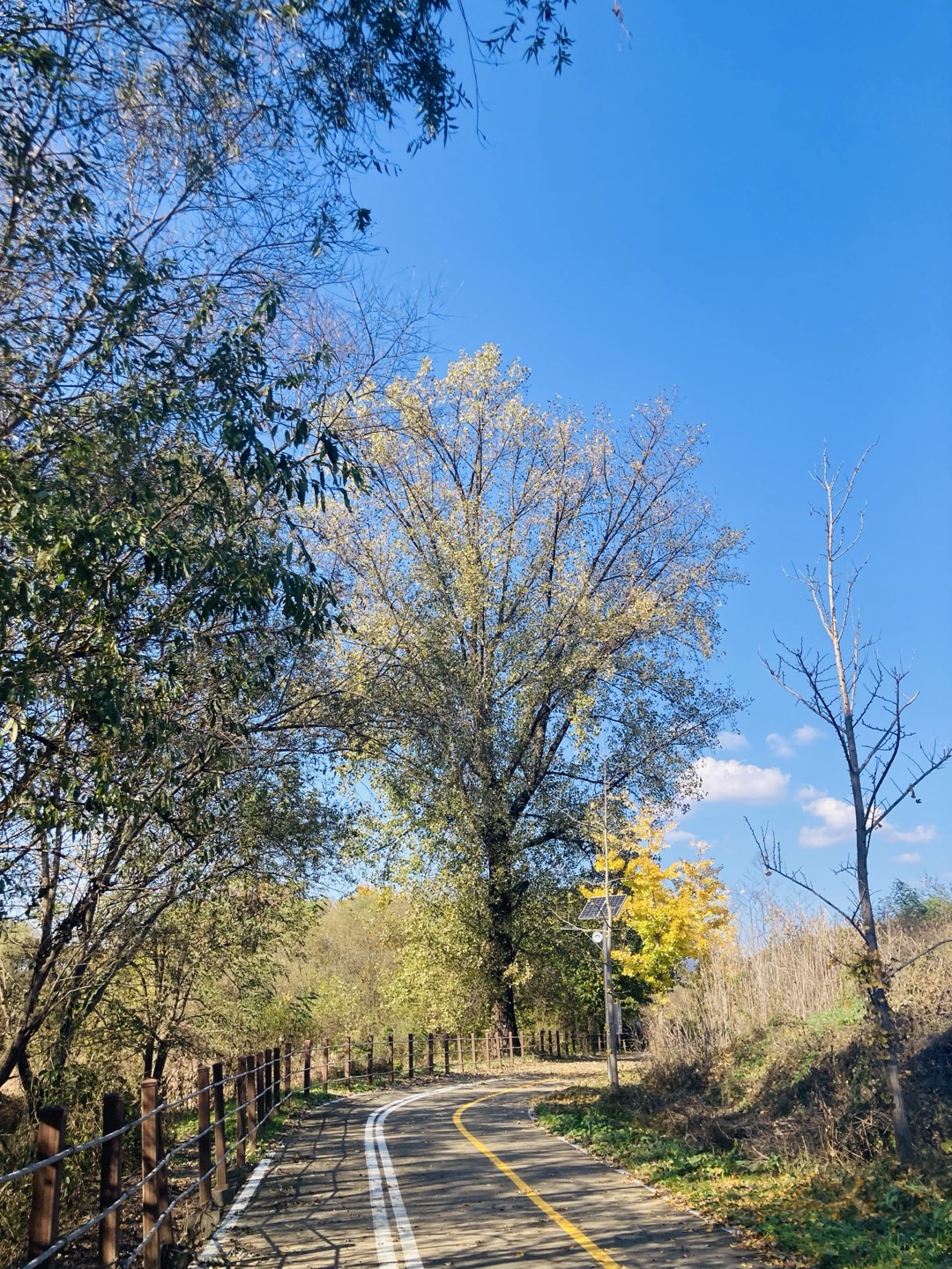 '바라보던 곳'에 가서 다시 바라보니 반대편의 햇살을 품은 풍경이 일품이었다. 햇빛이 잘 비춰서인지 물에 비친 아파트와 다리의 모습이 마치 인상파의 그림처럼 보였다고 할까. 좋다고 생각하면 해보면 된다. 좋아보인다고 생각했는데 정말 좋다. 이곳에서 보는 풍경만 좋은게 아니라 길도 좋았다. 가을가을한 갈색과 노란색의 나무들이 걷는 길 옆에 잘 서 있었고, 강변에는 풀들과 엉겨붙은 나무까지 인상적이었다.